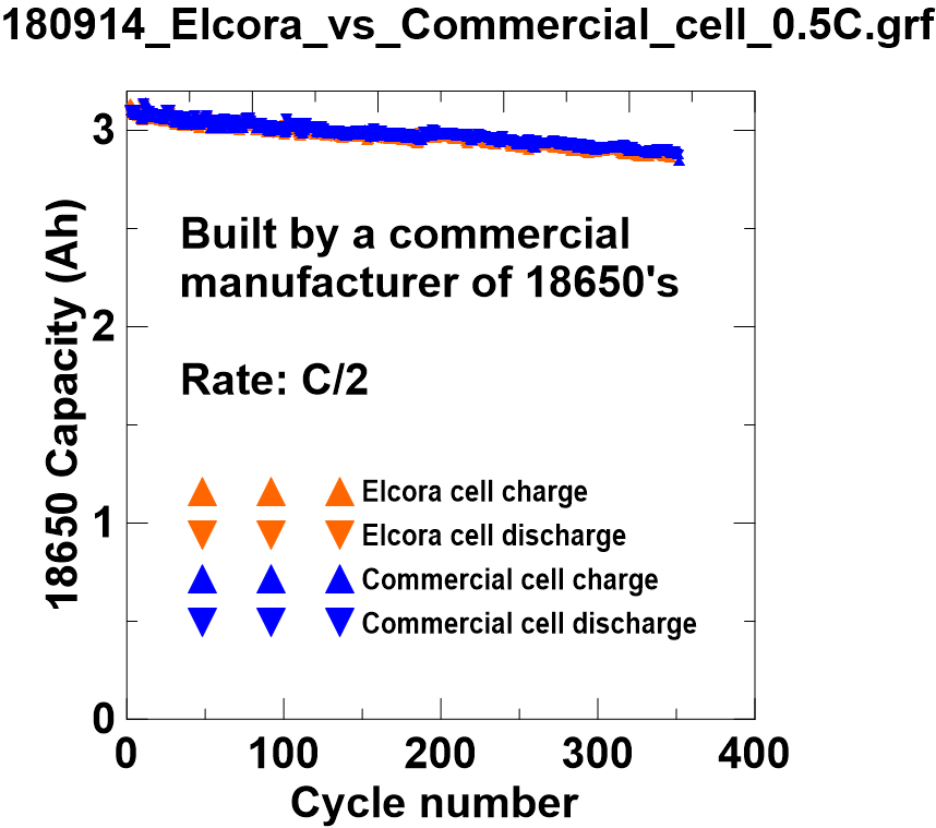Figure 1 shows 18650 capacity vs. cycle number from four 3.1 Ah 18650 cells. Two made from Elcora’s graphite anode powder (orange triangles), and two made from the commercial manufacturers’ standard graphite anode powder (blue triangles). The data shows that cell performance is virtually identical. That is, Elcora’s graphite anode powder is at least as good as the commercial manufacturers’ standard graphite anode powder.